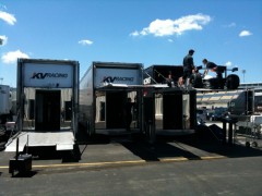こいのぼりはないですが…テストに来てます。 今度はケンタッキーです。 見て下さい!この鮮やかな青空。 風も穏やかで本当に気持ち良い天気です。 半袖でちょうどいい感じ。 ![]() が、しかし…… なんとバンクから水がしみ出ています。 ![]() 実はここケンタッキースピードウェイは、 雨水がバンク内に溜まってしまうことで有名らしく。 しかも地盤が湿ってるとかで(笑) 雨が降るとなかなか乾かないんだそうです。 空気はカラッとして本当に気持ち良いんですけどね〜。 1周下見してみましたが、 バンクの至る所で水が沸いてました。 ちなみに、この水を「weepers」って言うのだそうで。 weepingつまり、”涙が止まらない”ってことになるんですが、 なるほど…… って感心してる場合じゃありません! いつまでたっても走れないし。 例のジェットエンジンも出動したんですが、 バンクはどんどん涙ぐんじゃって… 走ったらどうなるの?と聞くと、 ダウンフォースで吸い上げられてさらに泣く!と。 「………」 ![]() 32番のマリオ組はピットストップ練習。 今回はシリーズの合同テストなので、 ペンスキーやチップガナッシなどのトップチームを含め、 ほとんどのチームが参加していましたが、 なんとなんと…… テスト中止が宣言されてしまいました!! えっ!?走んないの??まったく??? え〜〜〜、こんなにいい天気なのにぃ?? 晴れても走れないとは…… オーバル、恐るべし、です。 撤収っ!